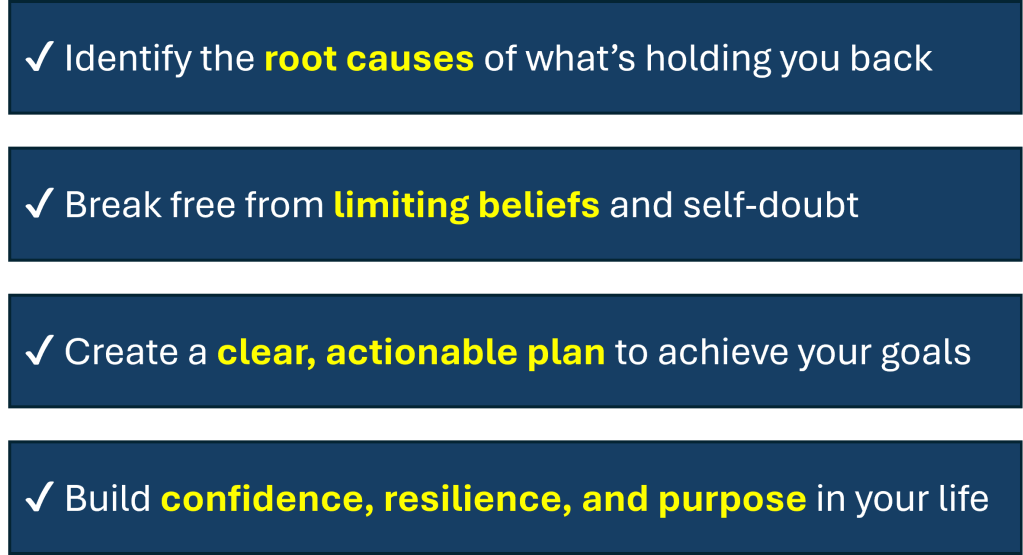 I believe that everyone has the potential to achieve great things—you just need the right mindset, tools, and support. Coaching isn’t about giving advice; it’s about helping you discover the answers within yourself. Together, we will uncover what’s been holding you back and create a plan to move forward with confidence.